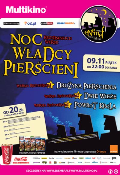 9. listopada (piątek) zostanie zagrana powtórka Nocy Reżyserskich Wersji Władcy Pierścieni, na miesiąc przed premierą "Hobbita". W repertuarze - wszystkie części trylogii oraz kilka godzin scen, które nie znalazły się w zwykłych wersjach.