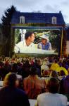 Filmowy wieczór pod chmurką: wielki ekran zawieszony na akademiku PS i setki studentów na kocach